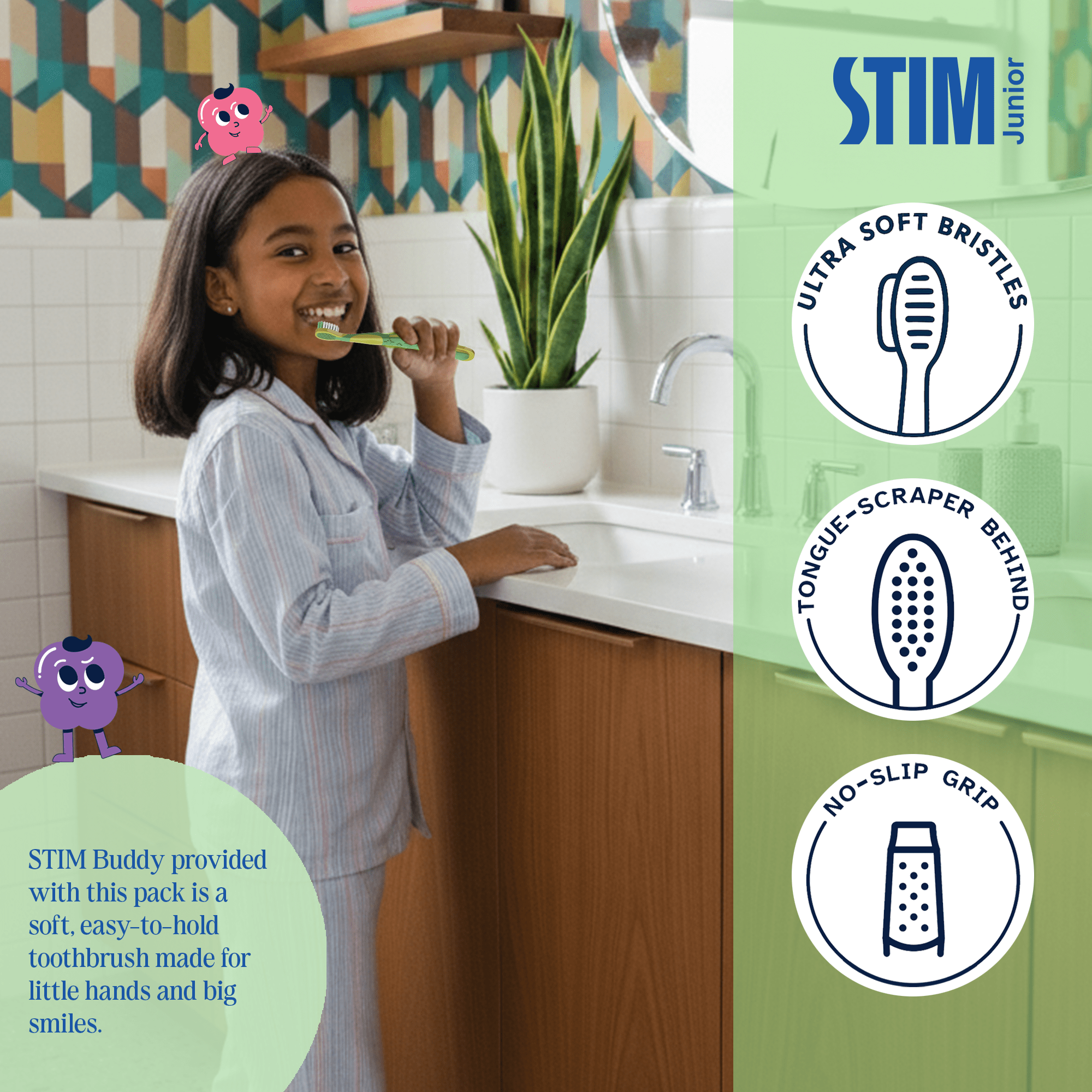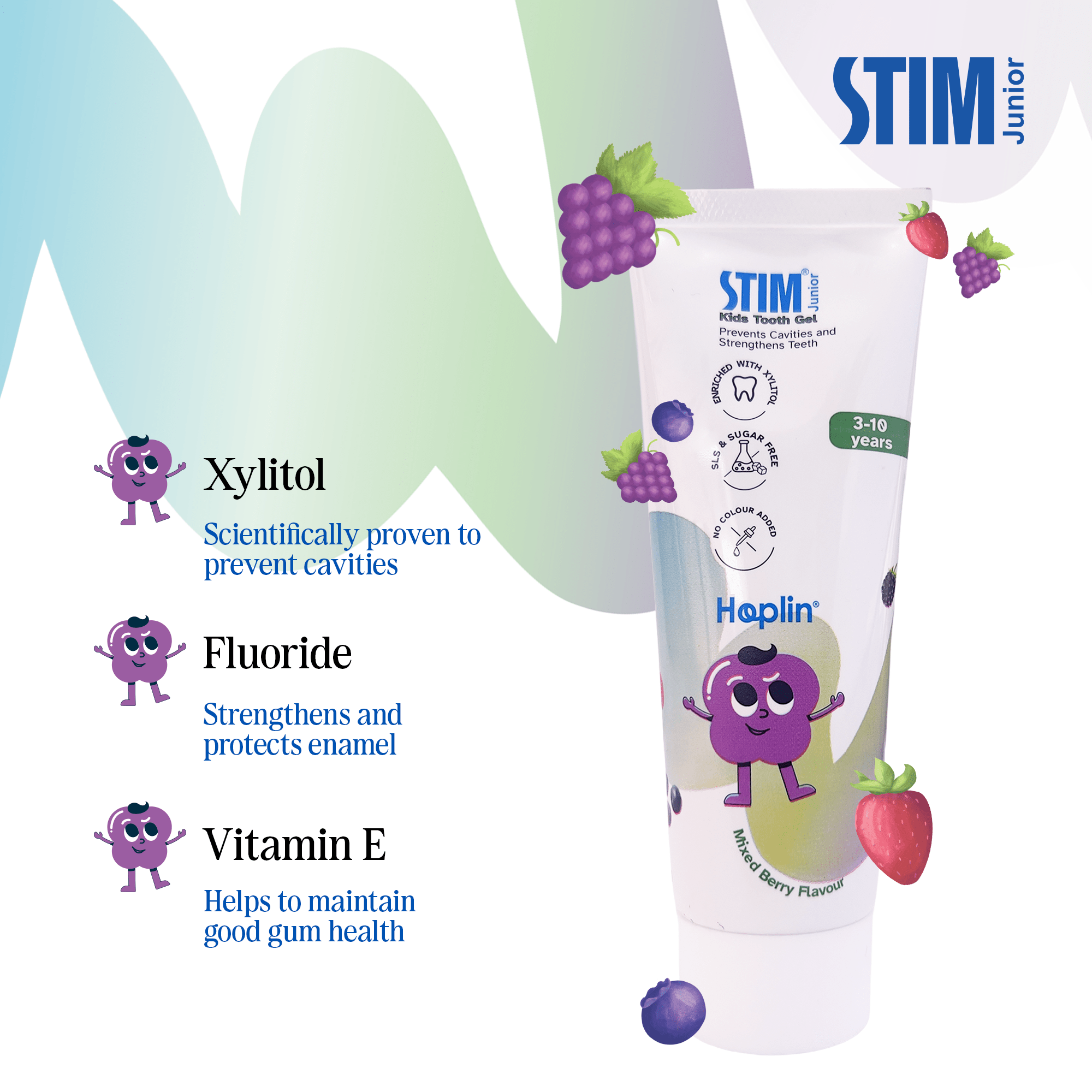 STIM Junior Kids Tooth Gel combines cavity-fighting Xylitol, age-appropriate fluoride, and soothing Vitamin E to strengthen teeth and gums. With a delicious mixed berry flavour, it’s a safe, enjoyable, sugar-free brushing habit.